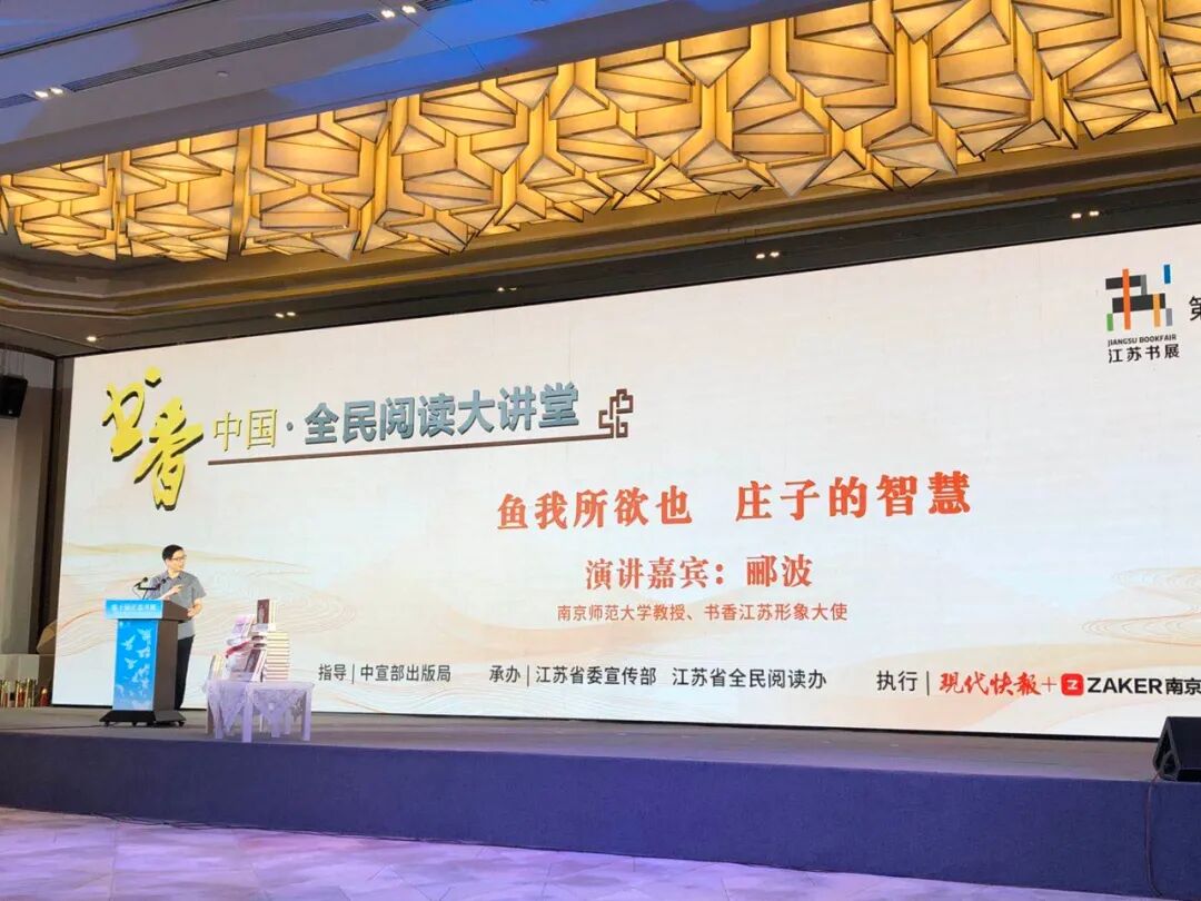 7月23日上午,第十届江苏书展“书香中国•全民阅读大讲堂”首场开讲,南京师范大学教授郦波带来主题演讲《鱼我所欲也——庄子的智慧》,向读者介绍了“中国四哲”之一战国中期思想家庄子的哲学思想,以及对当代人的启示。