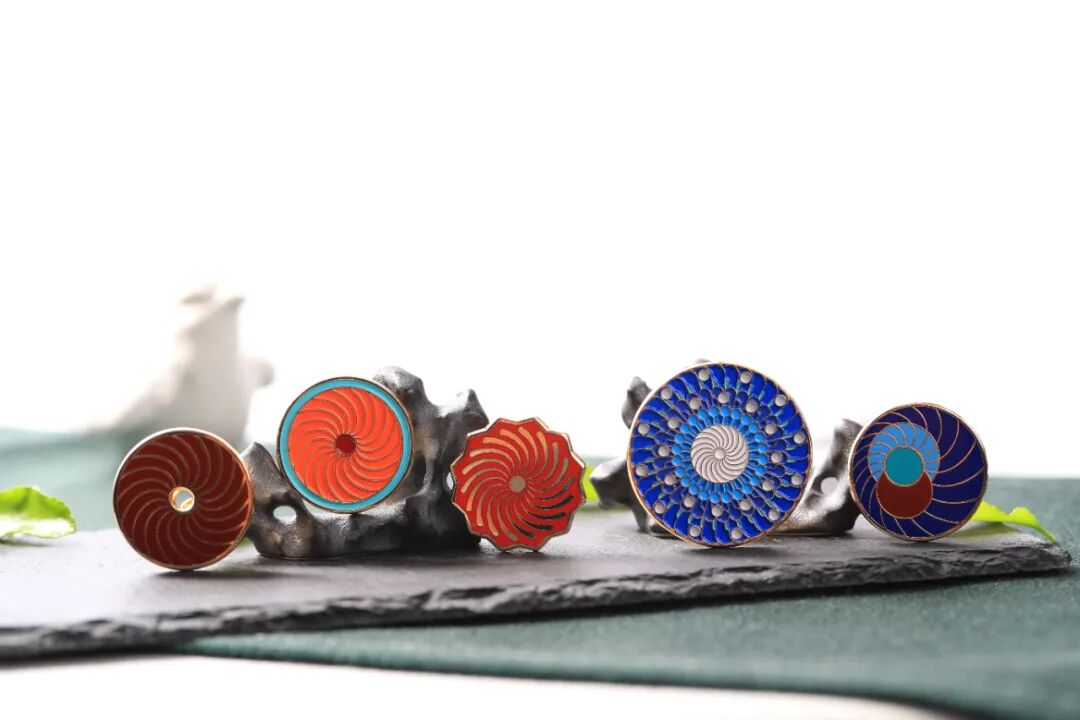 徽章整体形象以馆藏传统昆曲点翠顶花头面为蓝本,融合全晋会馆古戏台穹隆藻井的螺旋纹路,极具特色。通过锌合金制形、烤漆工艺上彩,以繁复的造型细节和色彩变化再现点翠顶花和穹窿藻井强烈的视觉印象。