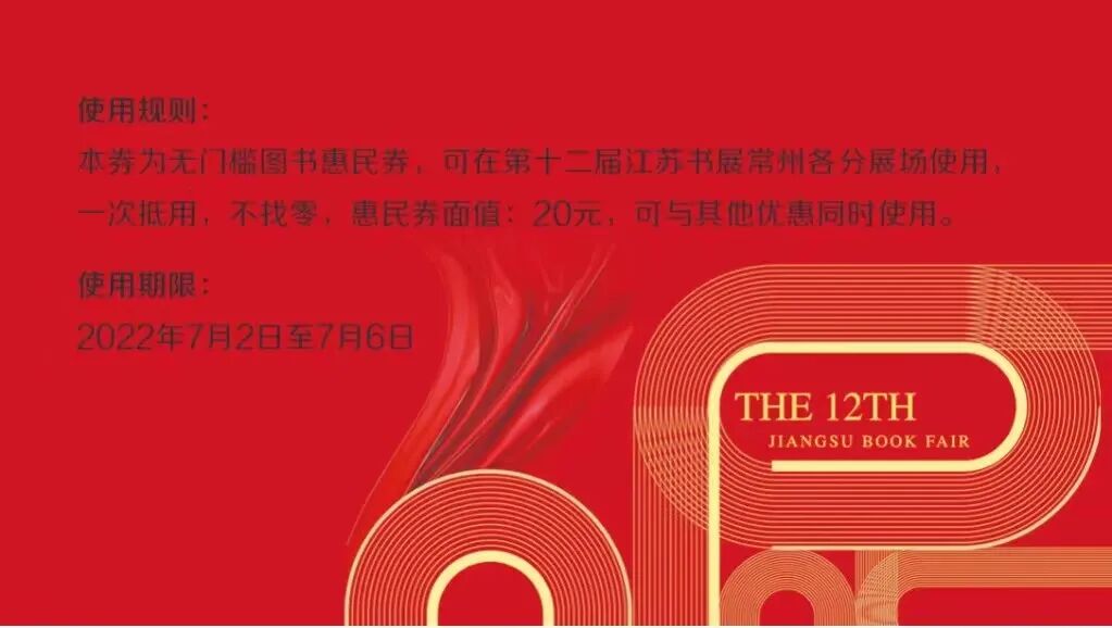 该券可在第十二届江苏书展常州各分展场使用,一次抵用,不找零。惠民券面值:20元,可与其他优惠同时使用。