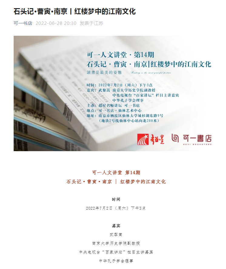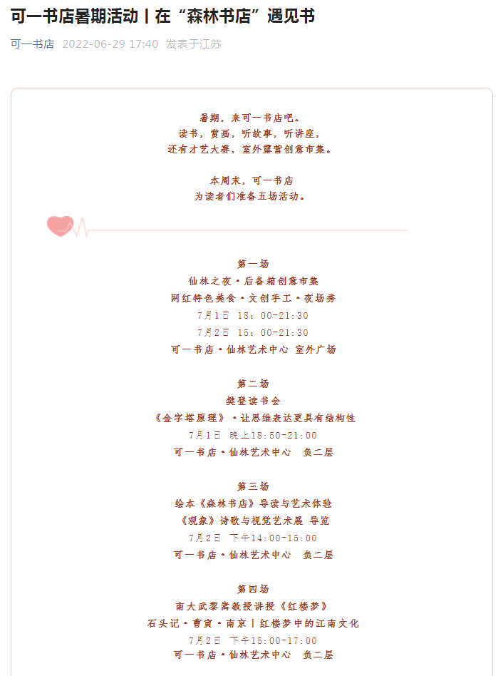 可一书店·仙林艺术中心,内有可一美术馆、可一文学馆、红楼梦生活馆、可一咖啡馆,定期举办读书活动,打造符合大学城特色的社区书店,努力构建南京城东文化新地标。7月2日至6日,可一书店将精心推出在“森林书店”遇见书和可一人文讲堂等系列阅读活动。