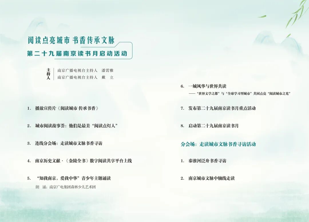 第二十九届南京读书月启动活动将突破空间局限,首次尝试以主会场(读书月启动活动)与分会场(走读城市文脉书香寻访活动)隔空互动模式进行视频直播,以CityRead文旅融合方式,从“天下文枢”到“世界文学之都”,品味南京千年文脉。