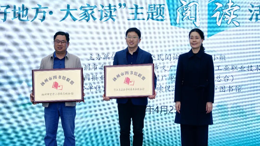 活动现场,为扬州市图书馆联盟邗江实验学校蒋王分校和育才小学西校区校园分馆授牌。